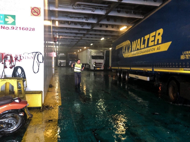 Μέσα στο πλοίο υπήρχαν 94 φορτηγά και 195 ΙΧ. Έντεκα φορτηγά υπέστησαν ζημιές, μικρές και μεγάλες ενώ ένα από αυτά παραμένει στο γκαράζ του πλοίου και πιθανολογείται ότι είναι αυτό από το οποίο ξεκίνησε η πυρκαγιά.
