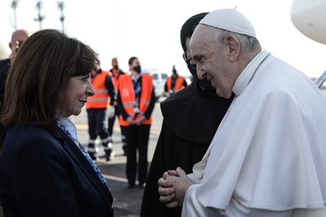 Ο υπουργός Μετανάστευσης και Ασύλου Νότης Μηταράκης, υποδέχθηκε στο προσωρινό Κέντρο Υποδοχής και Ταυτοποίησης της Λέσβου, στον Καρά Τεπέ (Μαυροβούνι) της Μυτιλήνης, την Πρόεδρο της Ελληνικής Δημοκρατίας Κατερίνα Σακελλαροπούλου και τον Προκαθήμενο της Ρωμαιοκαθολικής Εκκλησίας Πάπα Φραγκίσκο.