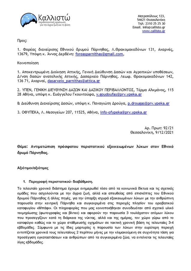 Σε συνέχεια των παραπάνω, η Περιβαλλοντική Οργάνωση “Καλλιστώ” σε ανακοίνωσή της αναφέρει ότι είχε ενημερώσει από τις 10 Δεκεμβρίου του 2021 για το φαινόμενο της εμφάνισης λύκων κοντά σε σημεία που κάνουν βόλτα πολίτες στην Πάρνηθα, ζητώντας λήψη μέτρων σε μεσοπρόθεσμο και μακροπρόθεσμο επίπεδο.