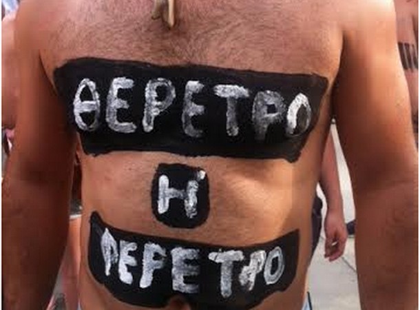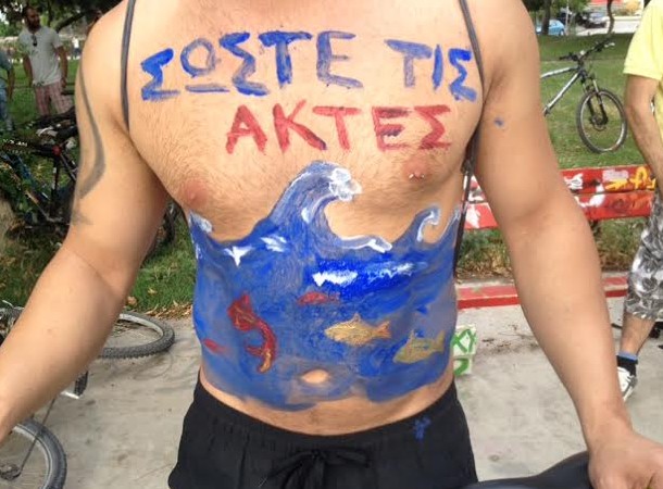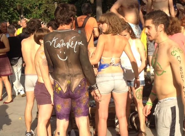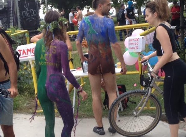 Αρκετοί άνδρες και γυναίκες, όλων των ηλικιών, δεν δίστασαν να εμφανιστούν γυμνοί ή ημίγυμνοι, έχοντας κάνει body painting, με μηνύματα, μεταξύ άλλων, κατά της εξόρυξης χρυσού στη Χαλκιδική, για τις παραλίες και την ΕΥΑΘ.
