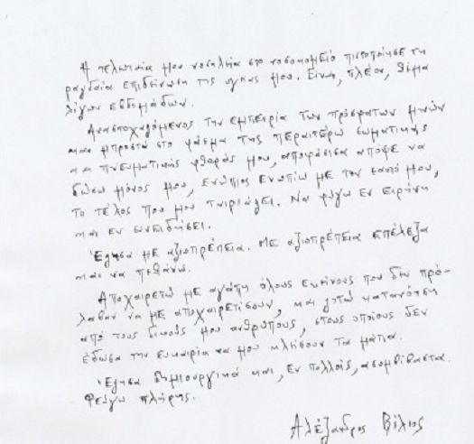 Η χειρόγραφη ανακοίνωση του Αλέξανδρου Βέλιου: