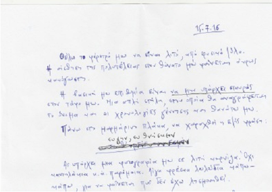 Αναστοχαζόμενος την εμπειρία των πρόσφατων μηνών και μπροστά στο φάσμα της περαιτέρω σωματικής και πνευματικής φθοράς μου, αποφάσισα απόψε να δώσω μόνος μου, ενώπιος ενωπίω με τον εαυτό μου, το τέλος που μου ταιριάζει. Να φύγω εν ειρήνη και εν συνειδήσει. Έζησα με αξιοπρέπεια. Με αξιοπρέπεια επέλεξα να πεθάνω.
