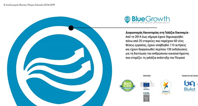 -Υλοποίηση του Διαγωνισμού Καινοτομίας στη Γαλάζια Οικονομία (BlueGrowth Initiative) που αποτελεί τον 1ο διαγωνισμό καινοτομίας για τη θαλάσσια οικονομία και το μοναδικό πρόγραμμα «επώασης» για Maritime startups στην Ελλάδα. Έχει εξασφαλισθεί χρηματοδότηση μέσω της ΟΧΕ/ΒΑΑ για τη συνέχιση στήριξης της νεοφυούς επιχειρηματικότητας ύψους 1,8 εκ €, ενώ από το 2014 έως σήμερα έχουν δημιουργηθεί πάνω από 25 εταιρείες που παρέχουν 60 νέες θέσεις εργασίας, έχουν υποβληθεί 115 αιτήσεις και έχουν διοργανωθεί περίπου 130 εκδηλώσεις για τη δικτύωση του ανθρώπινου οικοσυστήματος που στηρίζει τη γαλάζια ανάπτυξη του Πειραιά.