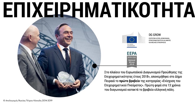 Στο πλαίσιο του «Ευρωπαϊκού Διαγωνισμού Προώθησης της Επιχειρηματικότητας έτους 2018», απονεμήθηκε στο Δήμο Πειραιά από την Ευρωπαϊκή Επιτροπή (DG GROW) το πρώτο βραβείο της κατηγορίας «Ενίσχυση του Επιχειρηματικού Πνεύματος». Η πρωτοβουλία του Δήμου Πειραιά ξεχώρισε μεταξύ 303 προτάσεων από 32 χώρες και αφορά σε ένα ολοκληρωμένο σύνολο αλληλένδετων δράσεων για τη στήριξη της γαλάζιας επιχειρηματικότητας.