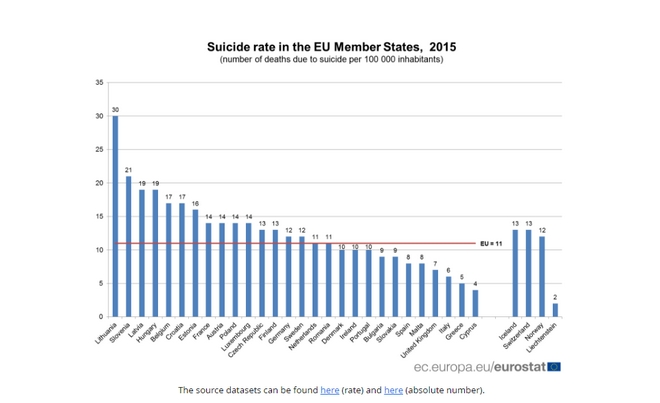 Η Ελλάδα διατηρεί μία από τις τελευταίες θέσεις στην Ευρωπαϊκή Ενωση στις αυτοκτονίες παρά τις δυσκολίες στα χρόνια του μνημονίου. Δυστυχής πρωταθλήτρια η Λιθουανία.