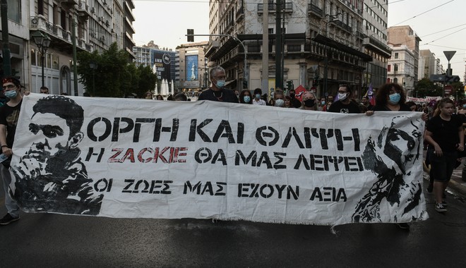 Συγκέντρωση και πορεία στη μνήμη του Ζακ Κωστόπουλου που άφησε την τελευταία του πνοή μετά από άγριο ξυλοδαρμό στις 21 Σεπτεμβρίου του 2018 στην οδό Γλάδστωνος πραγματοποιήθηκε στο κέντρο της Αθήνας.