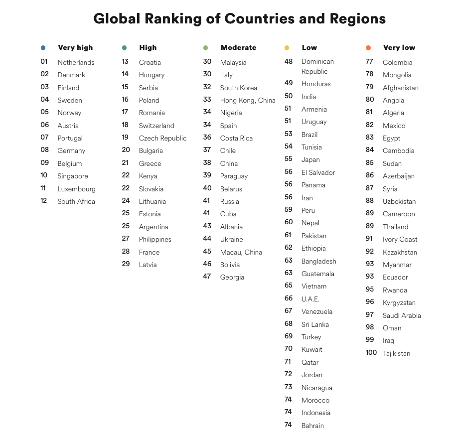 Η Ελλάδα τα τελευταία χρόνια επιτυγχάνει να βελτιώνει συνεχώς την θέση της σύμφωνα με τα στατιστικά του δείκτη. Έτσι από την 23η θέση ανάμεσα σε 80 χώρες το 2017 και την ίδια θέση ανάμεσα σε 88 το 2018, ανέβηκε στην 22η θέση ανάμεσα σε 100 χώρες το 2019 και στην 21η πέρυσι.