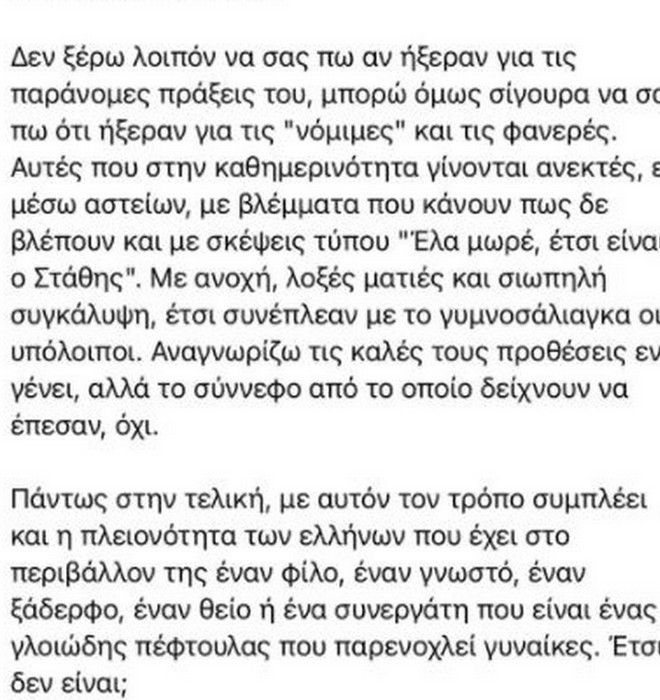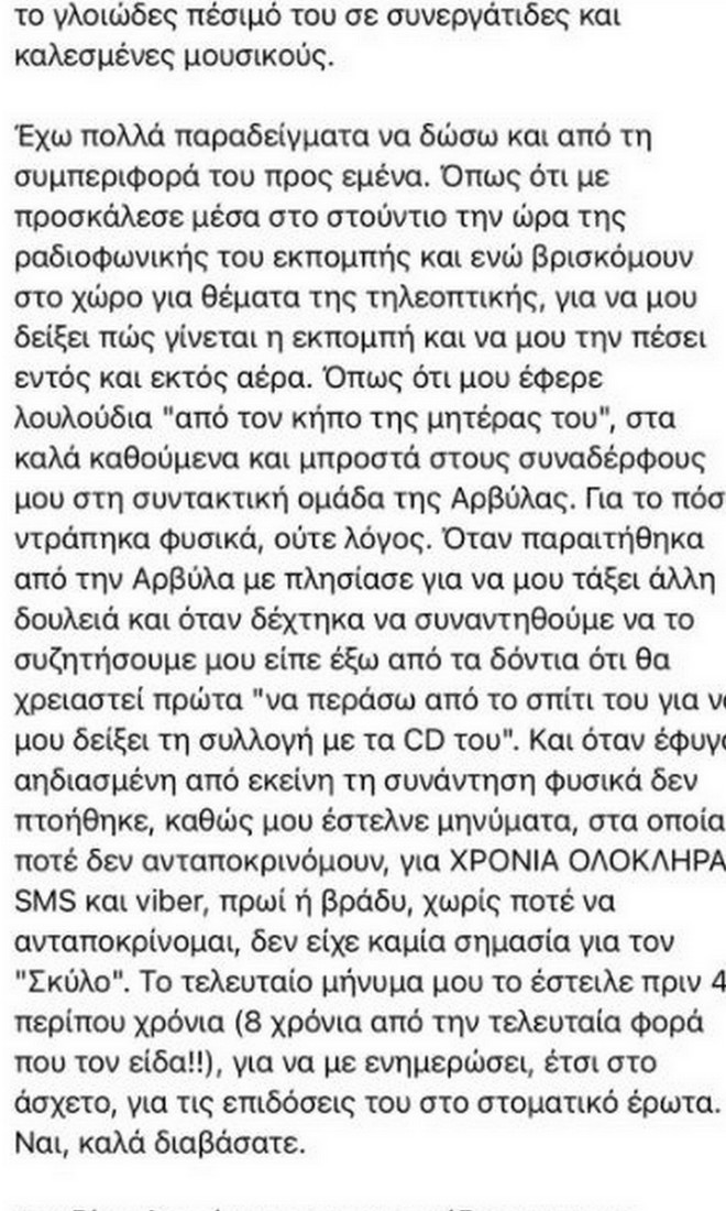 Όπως έγραψε μεταξύ άλλων, “ήξεραν ότι ο εν λόγω τύπος είναι ένας γλοιώδης παρενοχλητής. Ήξεραν ότι την πέφτει σε ό,τι κινείται, προχωρώντας άμεσα και σε κινήσεις – χοντράδες αν τυχόν η εκάστοτε κοπέλα προσπαθούσε να αρνηθεί με ευγενικό τρόπο. Ήξεραν όλοι ότι παρενοχλούσε τα κορίτσια στο γραφείο, στο στούντιο, όπου στεκόταν κι όπου βρισκόταν. Φαίνεται βέβαια και στην ίδια την εκπομπή όλα αυτά τα χρόνια πως είναι αποδεκτό από τους υπόλοιπους το γλοιώδες πέσιμό του σε συνεργάτιδες και καλεσμένες μουσικούς”.