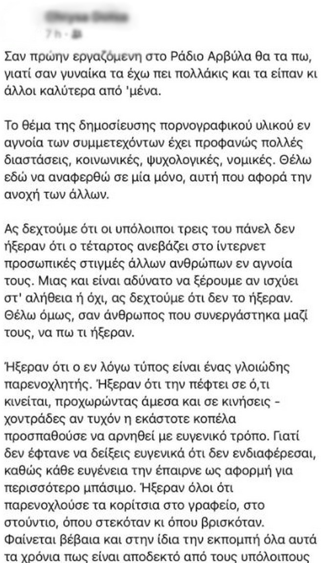 Μία πρώην εργαζόμενη της εκπομπής, λοιπόν, έκανε μία μακροσκελή ανάρτηση, στην οποία μοιράστηκε την εμπειρία της από το διάστημα όπου η ίδια εργάστηκε στο “Ράδιο Αρβύλα” και κατά το οποίο φέρεται να υπήρξε θύμα συστηματικής παρενόχλησης από τον Στάθη Παναγιωτόπουλο.