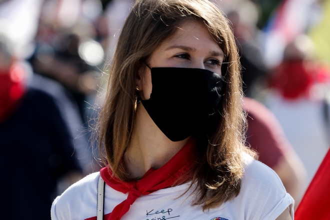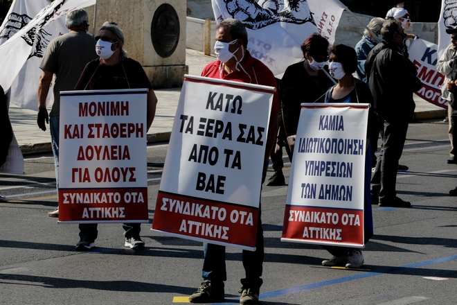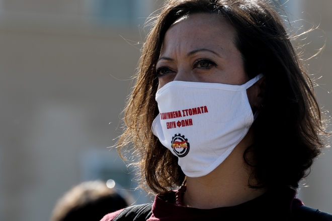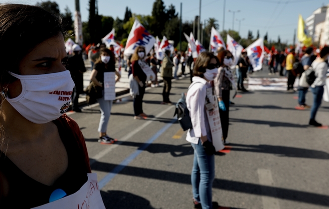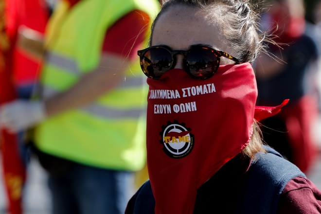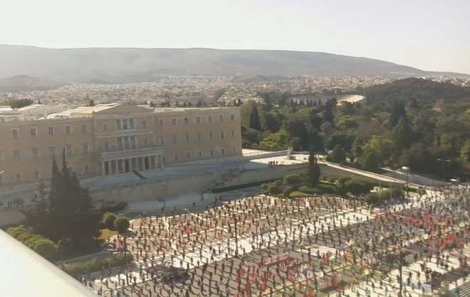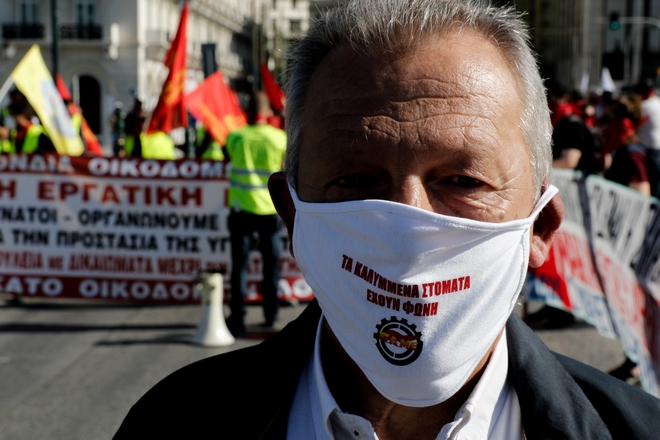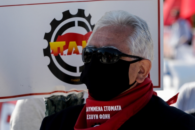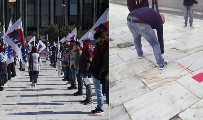 Με μέτρα προστασίας η συμβολική κινητοποίηση του ΠΑΜΕ με λίγα άτομα και αυστηρή τήρηση των δύο μέτρων. Αυτοκόλλητα στο οδόστρωμα για τις αποστάσεις.