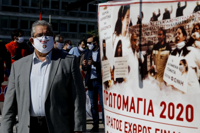 Τα μέλη του ΠΑΜΕ συγκεντρώθηκαν στο Σύνταγμα για την εργατική Πρωτομαγιά με αποστάσεις ασφαλείας στα πλαίσια των μέτρων περιορισμού της πανδημίας του κορονοϊού.