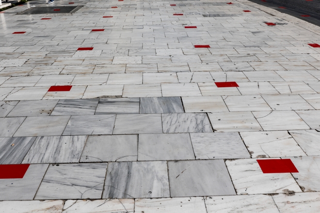 Γι αυτό το λόγο, οι διαδηλωτές κόλλησαν στην Πλατεία Συντάγματος, όπου κατέληξε η συμβολική πορεία των εργαζομένων, αυτοκόλλητα στο οδόστρωμα, τα οποία δείχνουν πόσο θα πρέπει να απέχει ο ένας διαδηλωτές από τον άλλο.