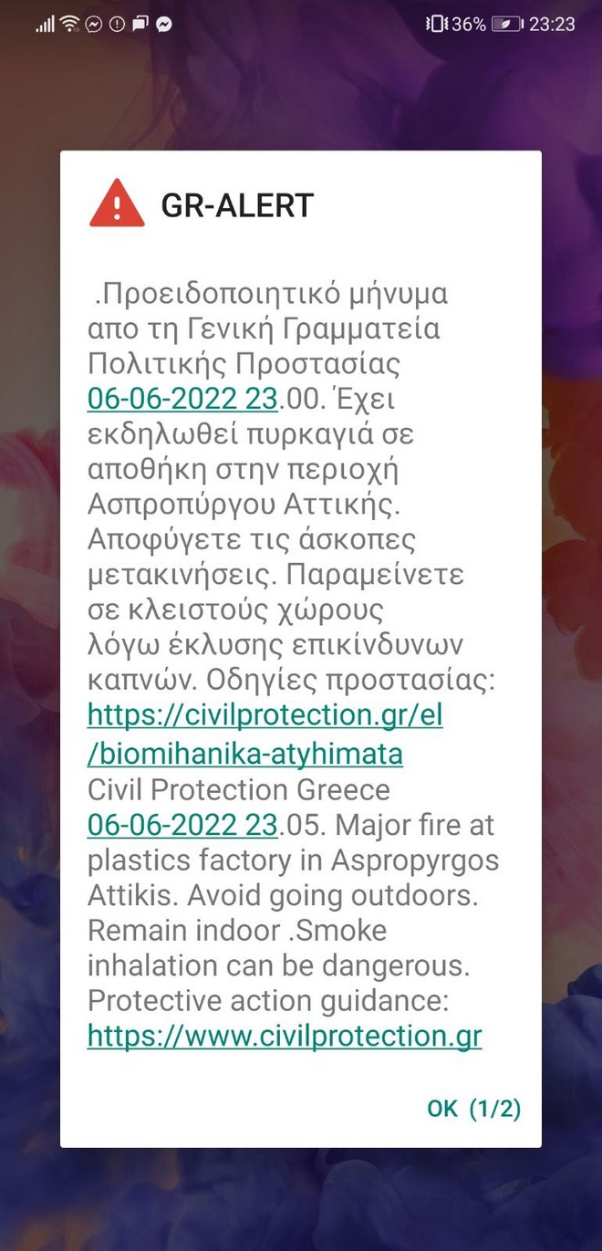 Μήνυμα στα κινητά τηλέφωνα των πολιτών έστειλε το 112 για την πυρκαγιά στον Ασπρόπυργο. “Επικίνδυνοι καπνοί. Παραμείνετε σε κλειστούς χώρους”, προειδοποιεί η Πολιτική Προστασία.