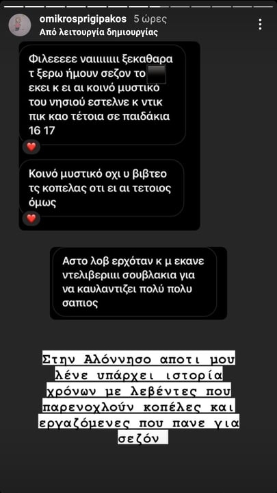 Η δράση του στο νησί ωστόσο, φαίνεται πως δεν προκάλεσε έκπληξη στους ντόπιους. Σύμφωνα με μαρτυρία που ήρθε στο NEWS 24/7, ο παρουσιαστής προσέγγιζε νεαρά κορίτσια χρησιμοποιώντας την “ιδιότητά” του. Σε μια εκ των περιπτώσεων, γνώρισε μια κοπέλα 19 περίπου ετών και αφού τη φλέρταρε σε μπαρ και παρά τη σαφή άρνησή της, συνέχισε το εμμονικό του “μαρκάρισμα” και σε επαγγελματικό γραφείο όπου εκείνη απασχολείτο. Τελικά σταμάτησε το “επίμονο φλερτ” μόνο μετά την παρέμβαση του πατέρα της.