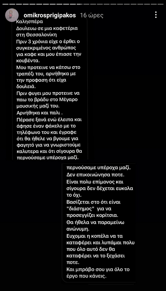 Σε άλλη ανάρτηση που κοινοποιήθηκε στο Instagram, καταγράφεται πως παρενοχλούσε συστηματικά κοπέλες με πρόστυχα καρέ.