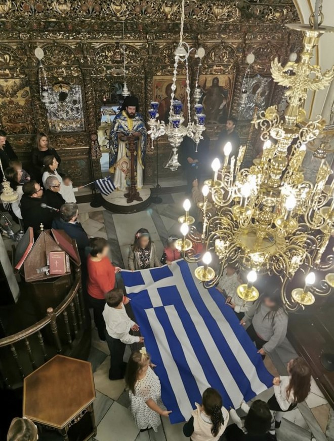Στην εικόνα, όπως αναφέρει το mykonosvoice.gr, που είναι από την δοξολογία το πρωί της Τετάρτης (28/10) φαίνεται ο κόσμος και τα μικρά παιδιά εντός του ναού, χωρίς να φοράει κανένας μάσκα και να είναι εκτεθειμένοι ο ένας δίπλα στον άλλον.