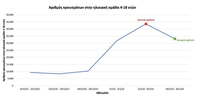 Σύμφωνα με την ανακοίνωση του υπουργείου Παιδείας “Κατά την πρώτη εβδομάδα λειτουργίας των σχολείων εντοπίστηκαν 10.414 λιγότεροι μαθητές ηλικίας 4-18 ετών θετικοί στον κορονοϊό, απ’ ό,τι την τελευταία εβδομάδα των διακοπών των Χριστουγέννων (από 43.608 θετικά κρούσματα μαθητών μείωση σε 33.194), και παρά το γεγονός ότι τα τεστ σε αυτή την ηλικιακή ομάδα αυξήθηκαν ραγδαία την πρώτη εβδομάδα λειτουργίας των σχολείων”.