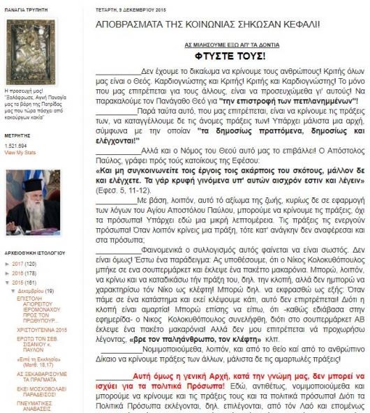 Ο Μητροπολίτης Καλαβρύτων και Αιγιαλείας Αμβρόσιος στις 4 Δεκεμβρίου 2015 δημοσίευσε σε προσωπικό ιστολόγιο που ίδιος διαχειρίζεται ένα άρθρο με τίτλο «ΑΠΟΒΡΑΣΜΑΤΑ ΤΗΣ ΚΟΙΝΩΝΙΑΣ ΣΗΚΩΣΑΝ ΚΕΦΑΛΙ!- Ας μιλήσουμε έξω απ τα δόντια ΦΤΥΣΤΕ ΤΟΥΣ!». Στο εν λόγω άρθρο, ο Μητροπολίτης καταφέρθηκε με απίστευτους χαρακτηρισμούς ενάντια στους ομοφυλόφιλους, προτρέποντας την υπόλοιπη «υγιή» κοινωνία στην άμεση, σκληρή και έμπρακτη αποδοκιμασία τους.