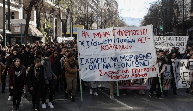 Σε εξέλιξη βρίσκεται αυτή την ώρα μαθητικό συλλαλητήριο στο κέντρο της Αθήνας. Οι μαθητές συγκεντρώθηκαν αρχικά στα Προπύλαια και κατευθύνονται προς τη Βουλή. Οι διαδηλωτές διεκδικούν, μεταξύ άλλων, τη μη εφαρμογή της εξίσωσης των πτυχίων των ΑΕΙ με αυτά των κολεγίων, ενώ ζητούν και να καλυφθούν τα κενά που υπάρχουν σε εκπαιδευτικό προσωπικό αλλά και οι ελλείψεις των υποδομών στα σχολεία.