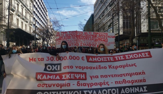 Με κεντρικό σύνθημα «Όχι στο νομοσχέδιο Κεραμέως, καμία σκέψη για πανεπιστημιακή αστυνομία- διαγραφές πειθαρχικά» οι διαδηλωτές και οι διαδηλώτριες συγκεντρώθηκαν αρχικά στα Προπύλαια και κατευθύνθηκαν στη Βουλή.