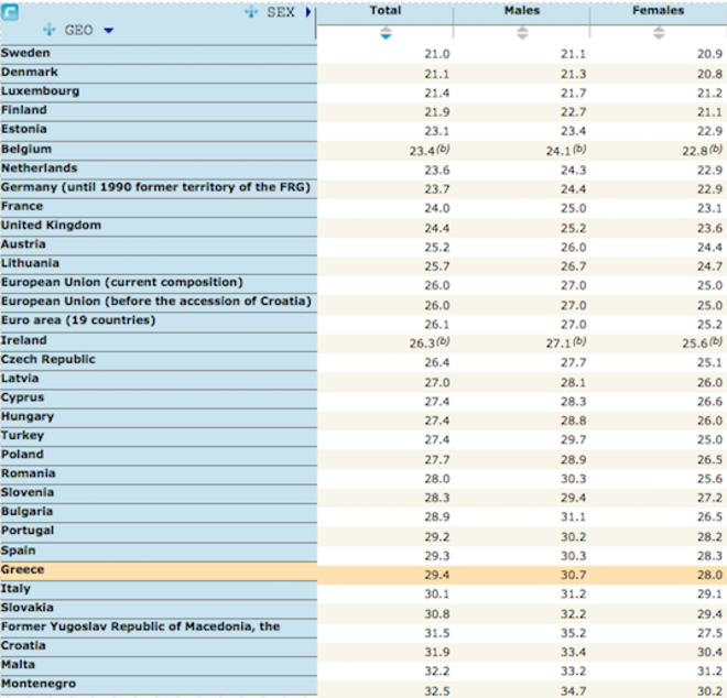 Στον αντίποδα και πάνω από την Ελλάδα βρίσκονται η Ιταλία (30,1 έτη) η Σλοβακία (30,8) η πΓΔΜ (31,5), η Κροατία (31,9) η Μάλτα (32,2) και το Μαυροβούνιο (32,5%).