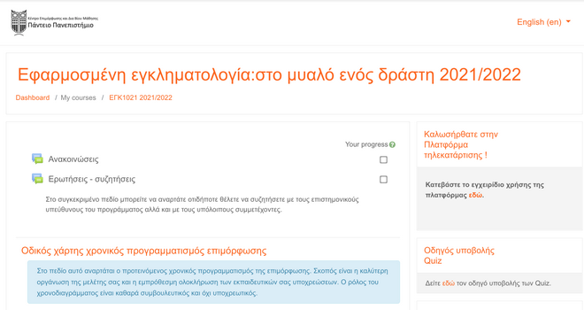 Ο κύκλος των σεμιναρίων Εγκληματολογίας διοργανώνεται από το Κέντρο Επιμόρφωσης και Διά Βίου Μάθησης του Παντείου. Έχει δίδακτρα και η διάρκειά του είναι επτά μήνες. Ο πλήρης τίτλος του προγράμματος είναι «Εφαρμοσμένη Εγκληματολογία: Στο μυαλό ενός δράστη» και πραγματοποιείται αποκλειστικά διαδικτυακά.
