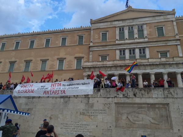 Διαδηλωτές που κρατούσαν σημαίες της ΑΝΤΑΡΣΙΑΣ ανέβηκαν στο περιστύλιο της Βουλής και κρέμασαν πανώ στο μνημείο του Άγνωστου Στρατιώτη με το μήνυμα «Ρήξη ή έξοδος από ΕΕ – ΕΚΤ και ΔΝΤ» και «Ήττα της κυβερνητικής πολιτικής ‘Οχι στο νέο μνημόνιο».