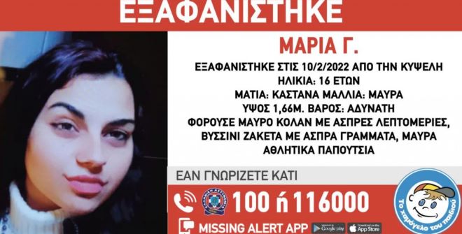 Στις 10.02.2022, στις 19.00μμ, εξαφανίστηκε από την περιοχή της Κυψέλης, η Μαρία Γ., 16 ετών, ελληνικής καταγωγής.