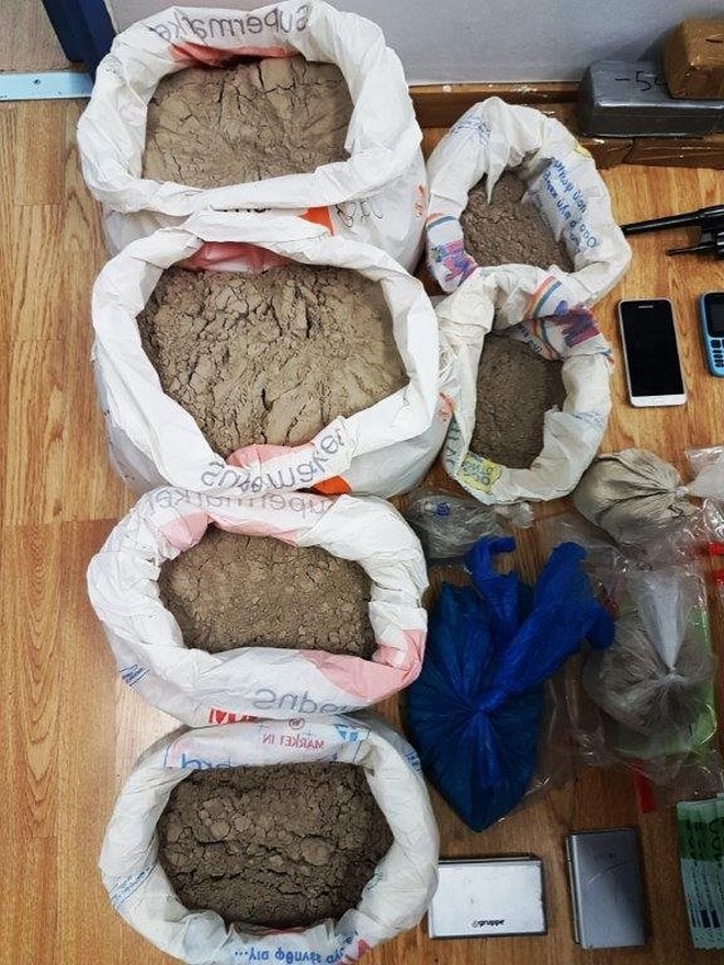 Σε έρευνα στο εργαστήριο βρέθηκαν, μεταξύ άλλων, και κατασχέθηκαν 14 κιλά και 854 γραμμάρια ηρωίνης, 334 δισκία φαρμακευτικών σκευασμάτων, δύο ηλεκτρονικές ζυγαριές ακρίβειας, 7.330 ευρώ, 145 δολάρια Ηνωμένων Πολιτειών της Αμερικής, 20 λίρες Αγγλίας και 3.000 λεκ Αλβανίας, περίστροφο, 7 κινητά τηλέφωνα, 4 πλαστικά φτυάρια (δοσομετρητές), με εμφανή ίχνη ηρωίνης, ζευγάρι ειδικών γυαλιών προστασίας, αντιασφυξιογόνος μάσκα, σφυρί, μαχαίρι, καθώς και ιδιόχειρες σημειώσεις και πλήθος νάιλον συσκευασιών.
