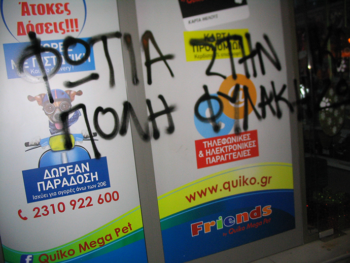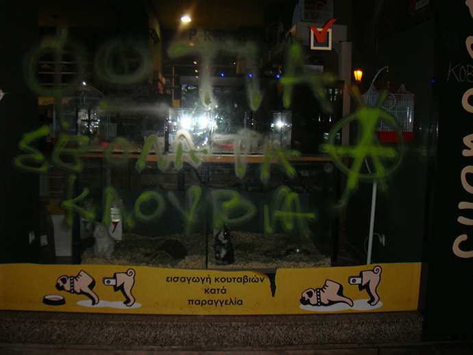Συνθήματα με σπρέι έγραψαν αναρχικοί σε pet shops στο κέντρο και τα ανατολικά προάστια της Θεσσαλονίκης.