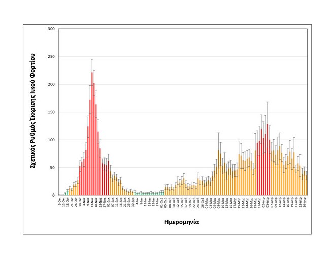Η τάση αποκλιμάκωσης που ξεκίνησε στις 7 Απριλίου συνεχίζεται και την τρέχουσα εβδομάδα και, όπως φαίνεται στα διαγράμματα που παρουσιάζει το ΑΠΕ-ΜΠΕ, σε απόλυτες τιμές το ιικό φορτίο μετράται πλέον στο 1/3 της υψηλότερης τιμής της περιόδου, που καταγράφηκε στις 5 Απριλίου.