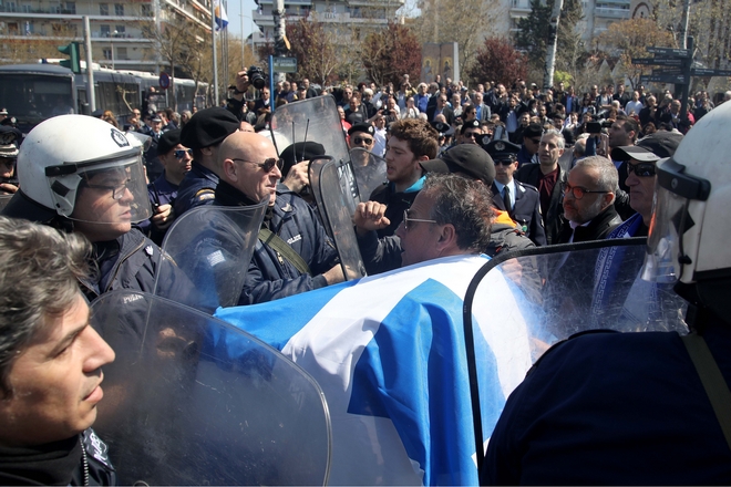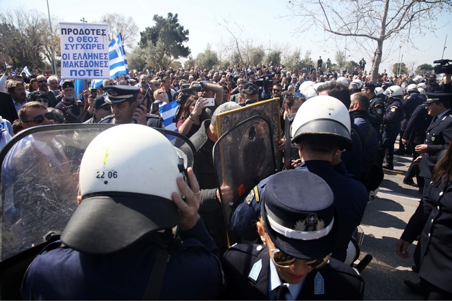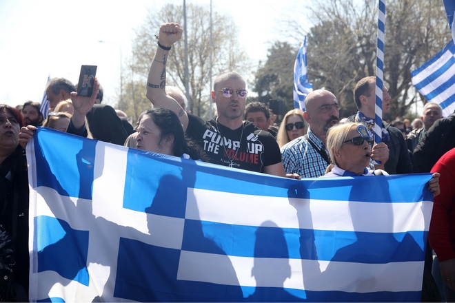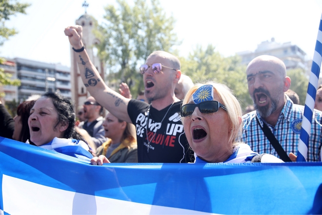 Μέλη του Ιερού Λόχου και της Χρυσής Αυγής, συγκεντρώθηκαν στην παραλιακή λεωφόρο της πόλης, στο ύψος του Γερμανικού Προξενείου και φώναζαν συνθήματα όπως “Ελλάς, Ελλάς Μακεδονία” και “Η Μακεδονία είναι Ελληνική, αλήτες προδότες, πολιτικοί”.