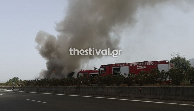 Όπως αναφέρει το Thestival, αυτή την ώρα, το ρεύμα προς Θεσσαλονίκη έχει κλείσει. Στο σημείο έχουν σπεύσει και επιχειρούν για την κατάσβεση τρία οχήματα της Πυροσβεστικής με 12 πυροσβέστες. Το όχημα κάηκε ολοσχερώς.
