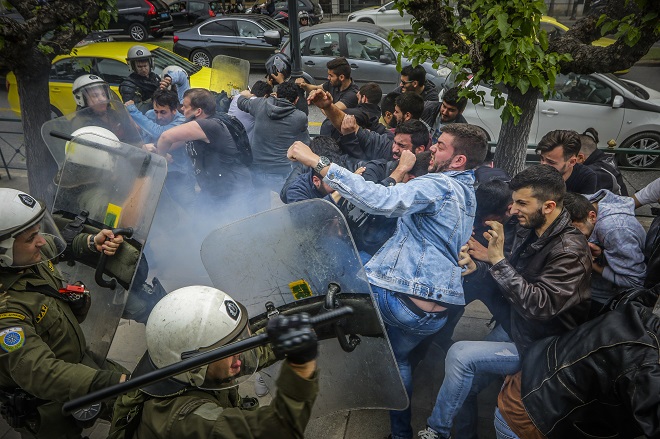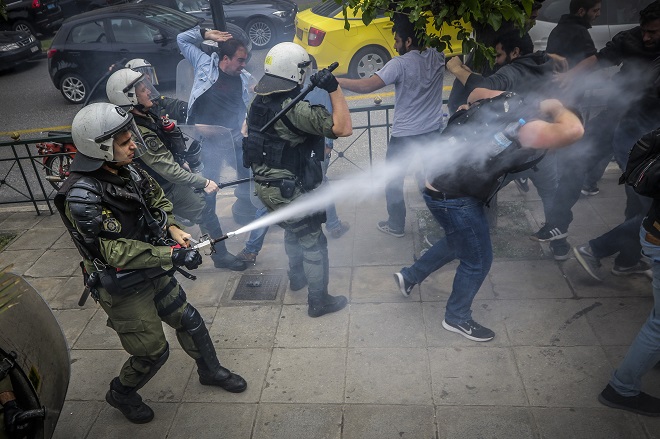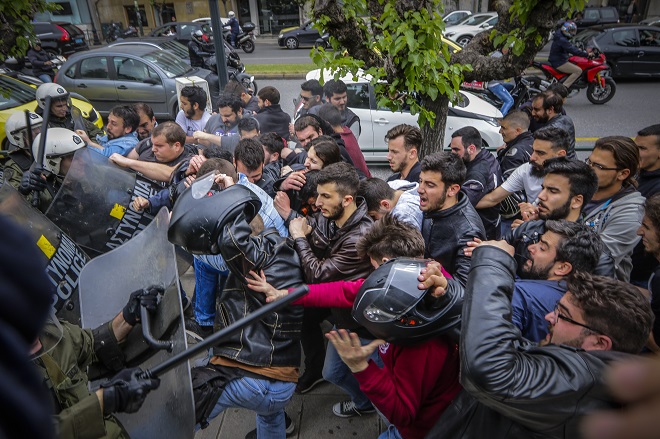 Αμέσως στο σημείο βρέθηκαν δυνάμεις των ΜΑΤ και για αρκετή ώρα υπήρχε μάχη σώμα με σώμα. Τα ΜΑΤ έκαναν χρήση χημικών και γκλομπ προκειμένου να τους απομακρύνουν από το σημείο. Εκτός από το συγκεκριμένο περιστατικό, οι διαδηλωτές πέταξαν αυγά περνώντας έξω από τη γαλλική πρεσβεία.