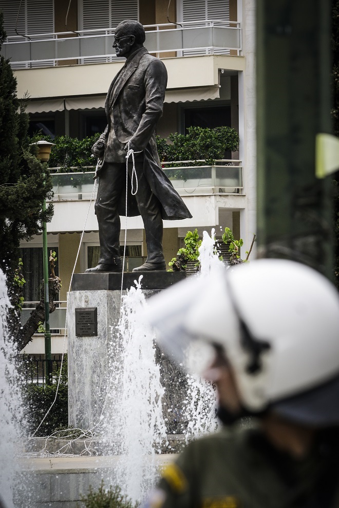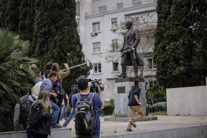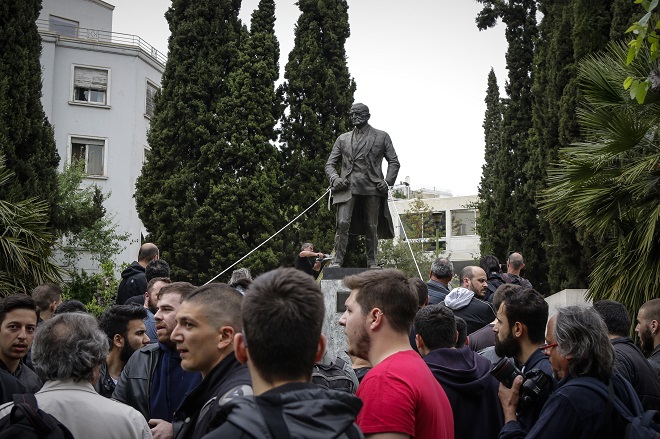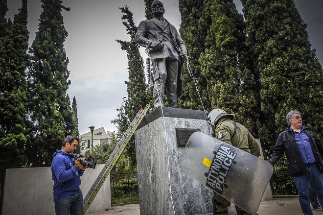 Ωστόσο, η “επιχείρηση αποκαθήλωσης” που οργάνωσαν φοιτητές και μαθητές, οι οποίοι συμμετείχαν στο αντιπολεμικό συλλαλητήριο (16 Απριλίου 2018), καταγράφεται ως μία από τις πλέον θεαματικές. Πρακτικά, έλαβαν μέρος και διαδηλωτές μεγαλύτερης ηλικίας, χρησιμοποιώντας και έναν αυτοσχέδιο τροχό.