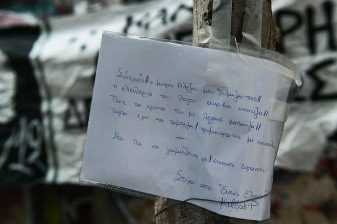 Τους παραπάνω στίχους από το κομμάτι “Εκτός Ελέγχου”, του δολοφονημένου από τη Χρυσή Αυγή Παύλου Φύσσα, έγραψε σε σημείωμα η Μάγδα Φύσσα και τοποθέτησε σε μία κολόνα στη συμβολή των οδών Τζαβέλλα και Μεσολογγίου, στο σημείο όπου ειδικος φρουρός Επαμεινώνδας Κορκονέας αφαίρεσε τη ζωή του Αλέξανδρου Γρηγορόπουλου πριν από 12 χρόνια.