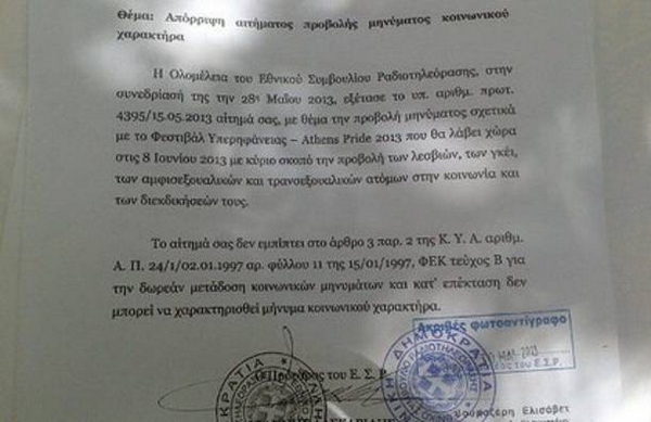 “Σε σχέση με το αίτημα σας σε σχέση με την προβολή μηνύματος σχετικά με το Φεστιβάλ Υπερηφάνειας- Athens Pride 2013, που θα λάβει χώρα στις 8 Ιουνίου του 2013, με κύριο σκοπό την προβολή των λεσβιών, των γκέι, των αμφισεξουαλικών και τον τρανσεξουαλικών ατόμων στην κοινωνία και των διεκδικήσεων τους.