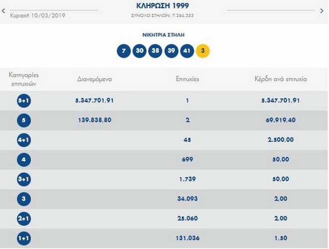 Υπενθυμίζεται ότι η κληρωτίδα έβγαλε τους εξής αριθμούς: 7, 30, 38, 39, 41