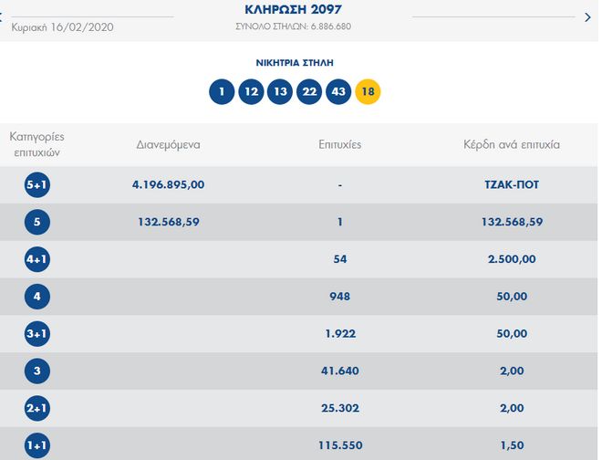 Οι τυχεροί αριθμοί είναι οι 1, 12, 13, 22, 43 και τζόκερ το 18.