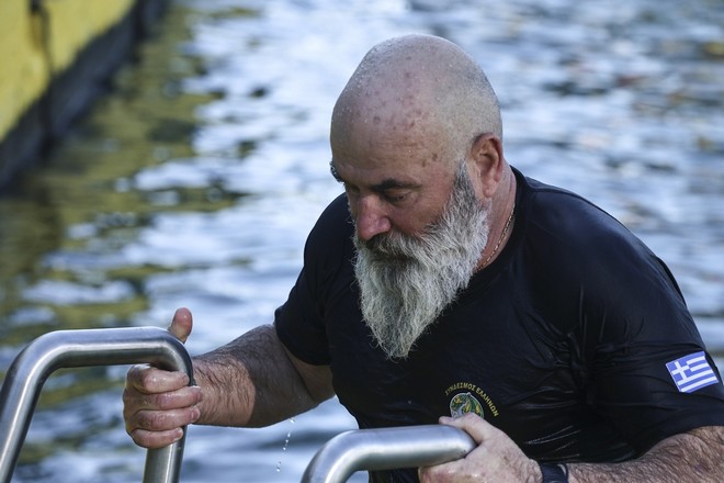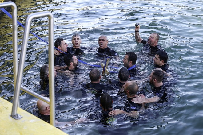 Μέλη της Ομάδας Υποβρυχίων Καταστροφών βούτηξαν στα νερά του Πειραιά και έπιασαν τον Τίμιο Σταυρό στην σημερινή λαμπρή τελετή αγιασμού των υδάτων.
