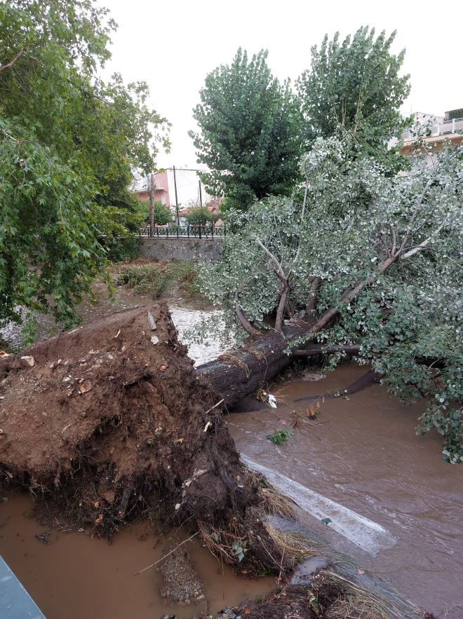 Από τις δυνατές ριπές του ανέμου, ξεριζώθηκαν δέντρα, ενώ λόγω των έντονων καιρικών φαινομένων, χωρίς ρεύμα έμειναν πολλές περιοχές.
