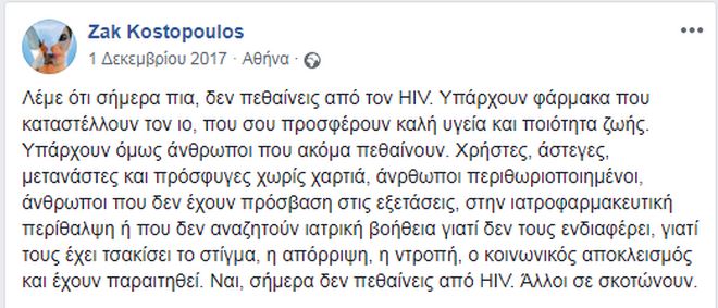 Ως τραγική ειρωνεία και παιχνίδι της μοίρας μπορεί κανείς να λάβει σήμερα τα όσα ο άτυχος Ζακ Κωστόπουλος έγραφε πριν από ακριβώς ένα χρόνο την 1η Δεκεμβρίου του 2018 ανήμερα της Παγκόσμιας Μέρας κατά του AIDS.