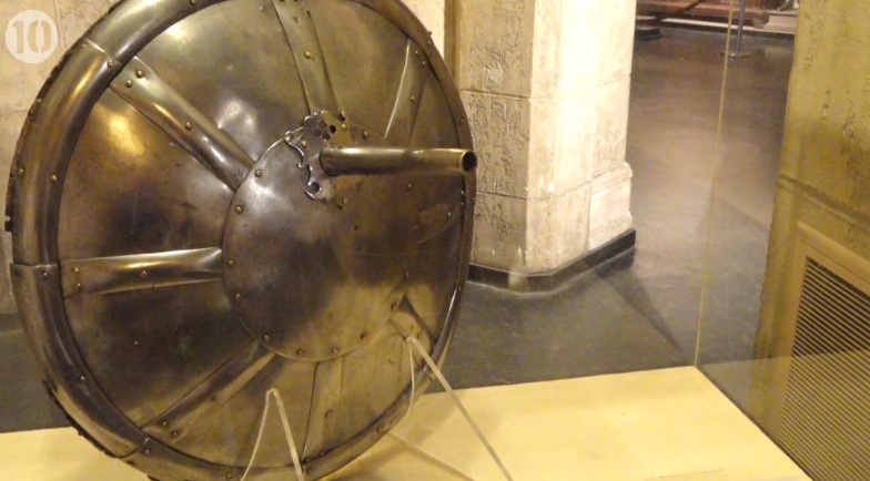 Ακολουθεί η μεσαιωνική “ασπίδα-πυροβόλο”. Κατασκευαστής ήταν ο Giovanni Battista of Ravenna και την πρότεινε στο Βασιλιά της Αγγλίας Henry VIII, με εκείνον να παραγγέλνει 100 τέτοια κομμάτια. Οι Βρετανοί εξόπλισαν πλοία τους με παρόμοιες, μεγαλύτερες ασπίδες που κατασκεύασαν μέσα στα επόμενα χρόνια μόνοι τους, μετά το 1544 όταν και έγινε η πρώτη παρουσίαση του όπλου.