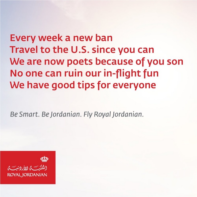 Ο πιο καυστικός ωστόσο σχολιασμόςου μέτρου που έλαβαν ΗΠΑ-Βρετανία για την αντιμετώπιση μιας “αδιευκρίνιστης τρομοκρατικής απειλής” έρχεται από τη Royal Jordan, η οποία εξέδωσε ένα ξεκαρδιστικό τρίπτυχο ανακοινώσεων.