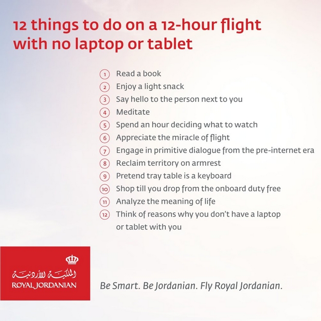 Στις πρώτες δύο ανακοινώσεις, η αεροπορική εταιρεία της Ιορδανίας καταμετρά 13 προτάσεις δραστηριοτήτων, στις οποίες μπορούν να επιδοθούν οι επιβάτες μιας πτήσης εάν δεν έχουν μαζί τον υπολογιστή ή το τάμπλετ τους: