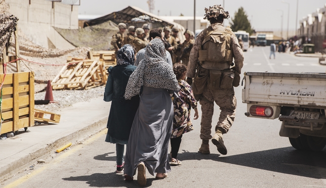 Αμερικανικές δυνάμεις, συνοδεύουν Αφγανούς κατά τη διάρκεια εκκένωσης, στο αεροδρόμιο της Καμπούλ. ap/Lt. Mark Andries