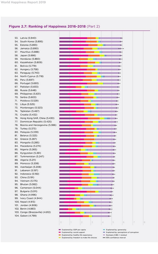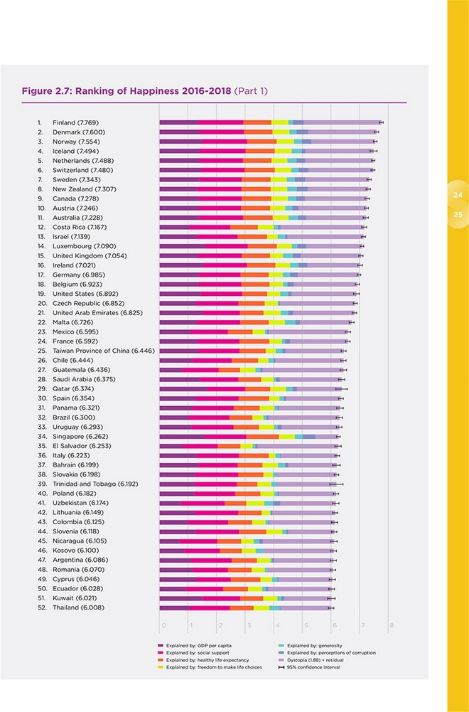 Τα παραπάνω προκύπτουν από την έρευνα World Happiness Report που πραγματοποίησε το Ινστιτούτο Gallup, λαμβάνοντας υπόψη πλήθος στοιχείων από το 2016 και για την τελευταία τριετία, όπως το ΑΕΠ, η στήριξη από τους φίλους, το προσδόκιμο ζωής, οι ατομικές ελευθερίες, κ.α., όπως αναφέρει το Bloomberg που την αναδημοσίευσε.