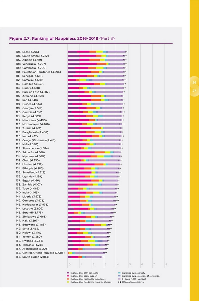 Η Αφρική έχει την “τιμητική” της στις πιο δυστυχισμένες χώρες, αφού στις τελευταίες θέσεις συναντάμε μεταξύ άλλων το Μαλάουι, τη Ρουάντα, την Τανζανία και την Κεντροαφρικανική Δημοκρατία.