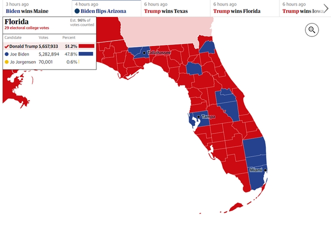 Η Πολιτεία της Φλόριντα κατέγραψε νίκη του Ντόναλντ Τραμπ με ποσοστό κοντά στο 51,2%, με τον Μπάιντεν να φτάνει στο 47,8% στο 96% της ενσωμάτωσης.