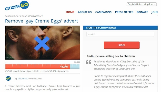 “Επιλέγοντας ένα ομόφυλο ζευγάρι, η Cadbury ξεκάθαρα ελπίζει να προκαλέσει αντιπαράθεση και να διαφύγει της αρνητικής κριτικής. Γνωρίζει καλά την θρησκευτική σημασία του Πάσχα και προσβάλλει τα μέλη της χριστιανικής κοινότητας στη διάρκεια της πιο σημαντικής γιορτής στο ημερολόγιό τους” επισημαίνει η καμπάνια. “Η έκθεση παιδιών σε σεξουαλικό περιεχόμενο συνιστά μορφή κακοποίησης. Είναι γνωστό πως τα παιδιά συχνά αντιγράφουν ό,τι βλέπουν την οθόνη”.